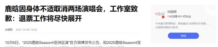 2025年10月16日鹿晗方发布公告在四巡中的吉隆坡站、东京-横滨站演出取消。